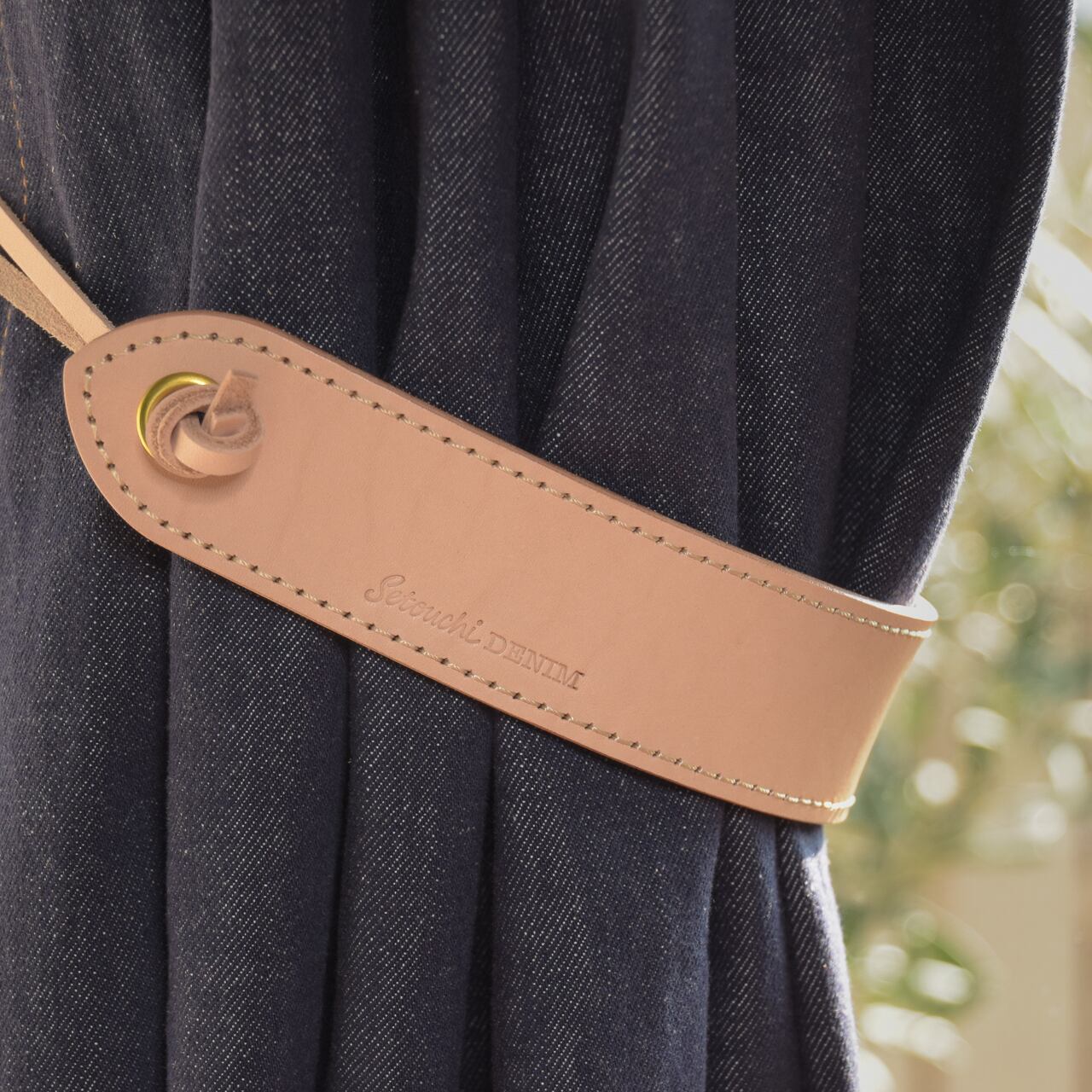 自然素材のデニムカーテンに似合う、本物の革(素材:牛)を用いてベルトをイメージしたタッセルです。