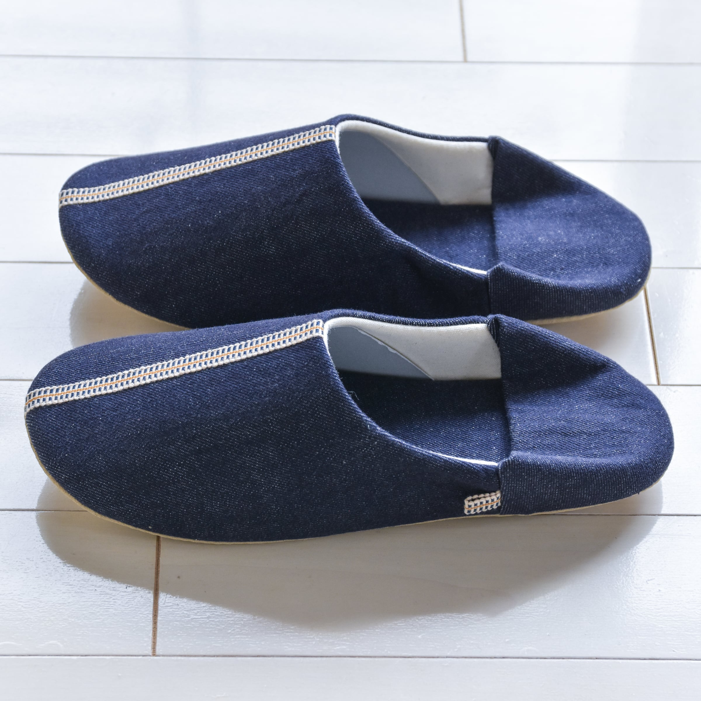生地・真田紐は国産デニム日本一の広島県福山市から、100%国内生産のルームシューズです。