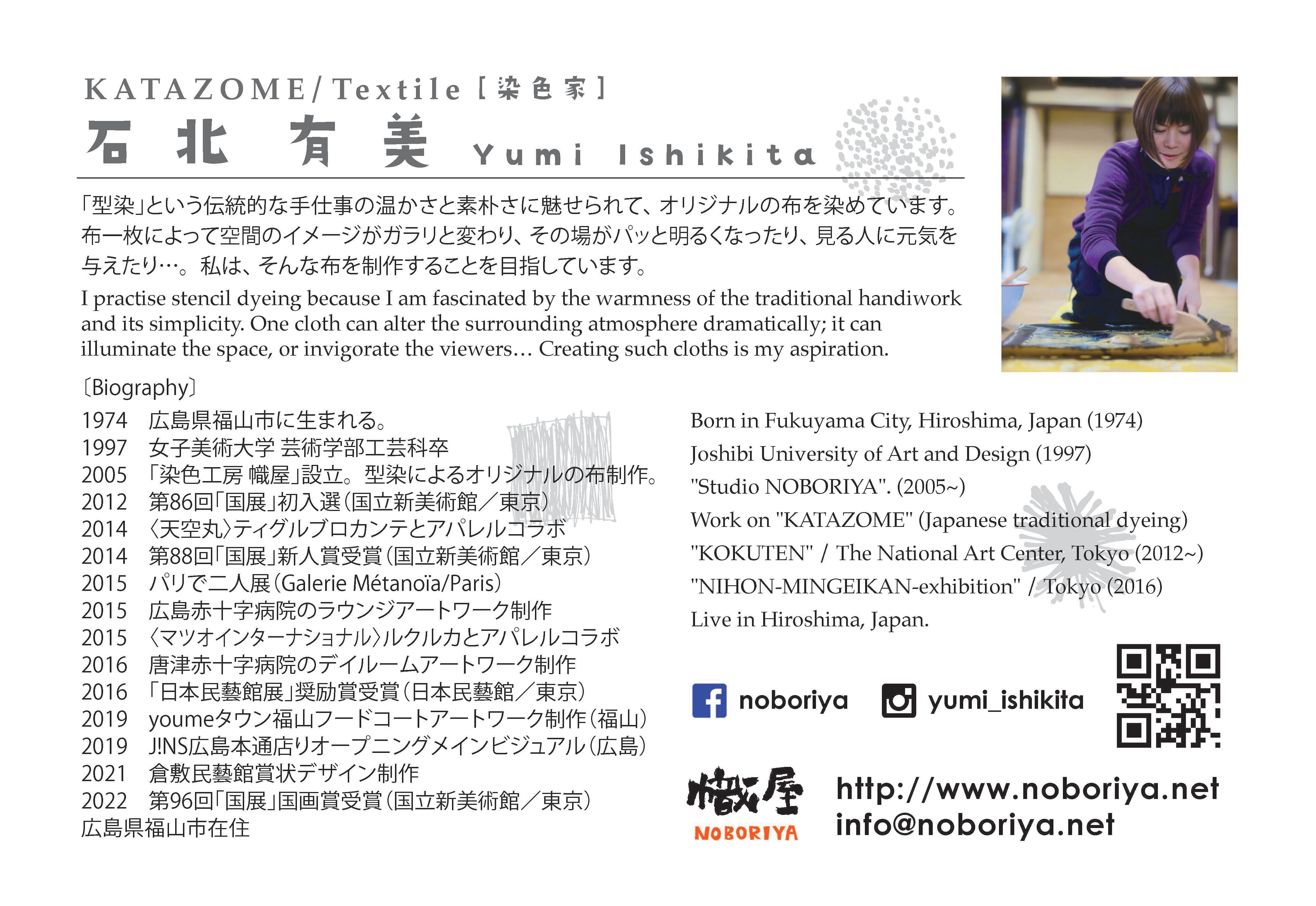 瀬戸内デニムと同じ広島県福山市在住の、伝統的な「型染」の技法でオリジナルの布を製作する人気の作家兼デザイナーの石北有美さんとのコラボで、