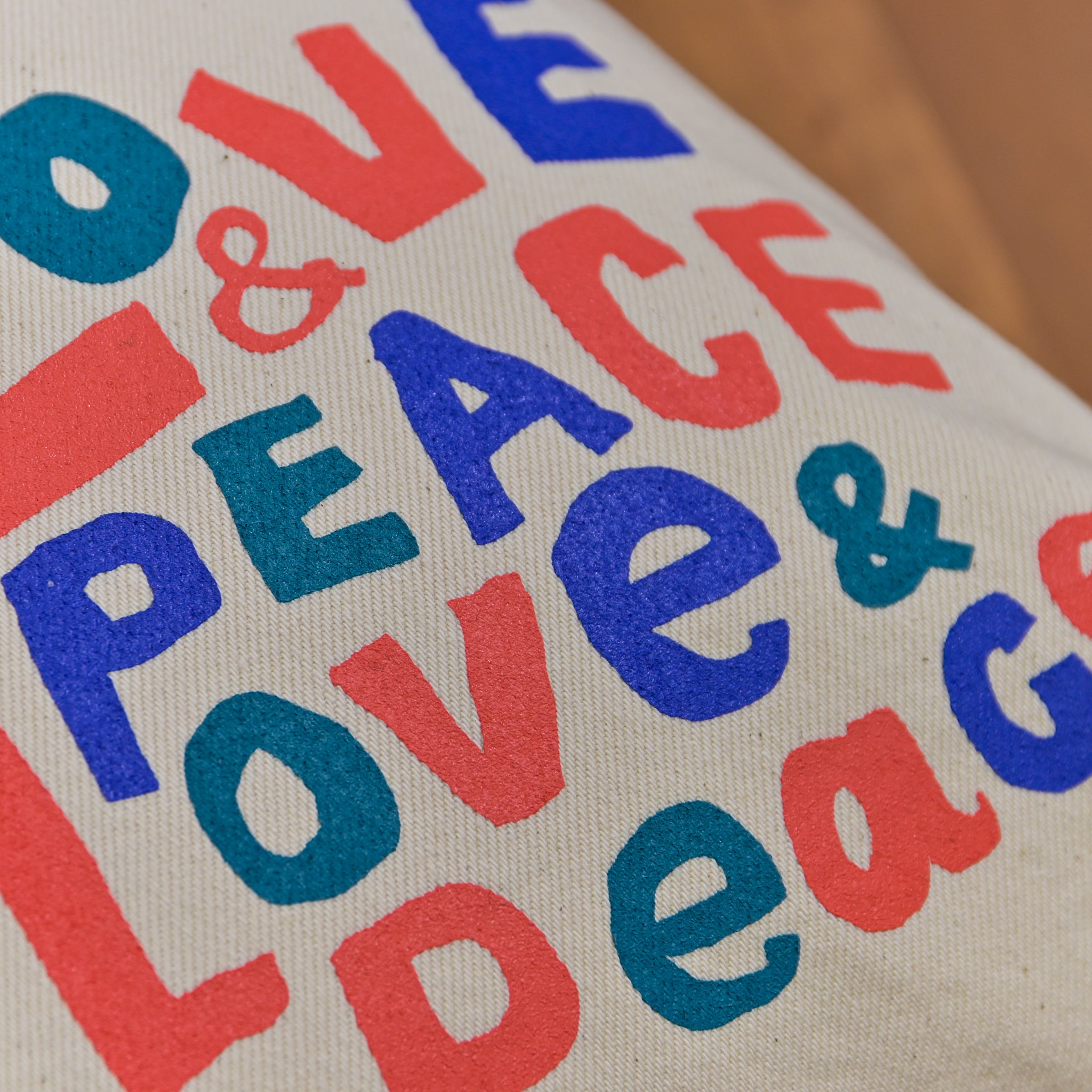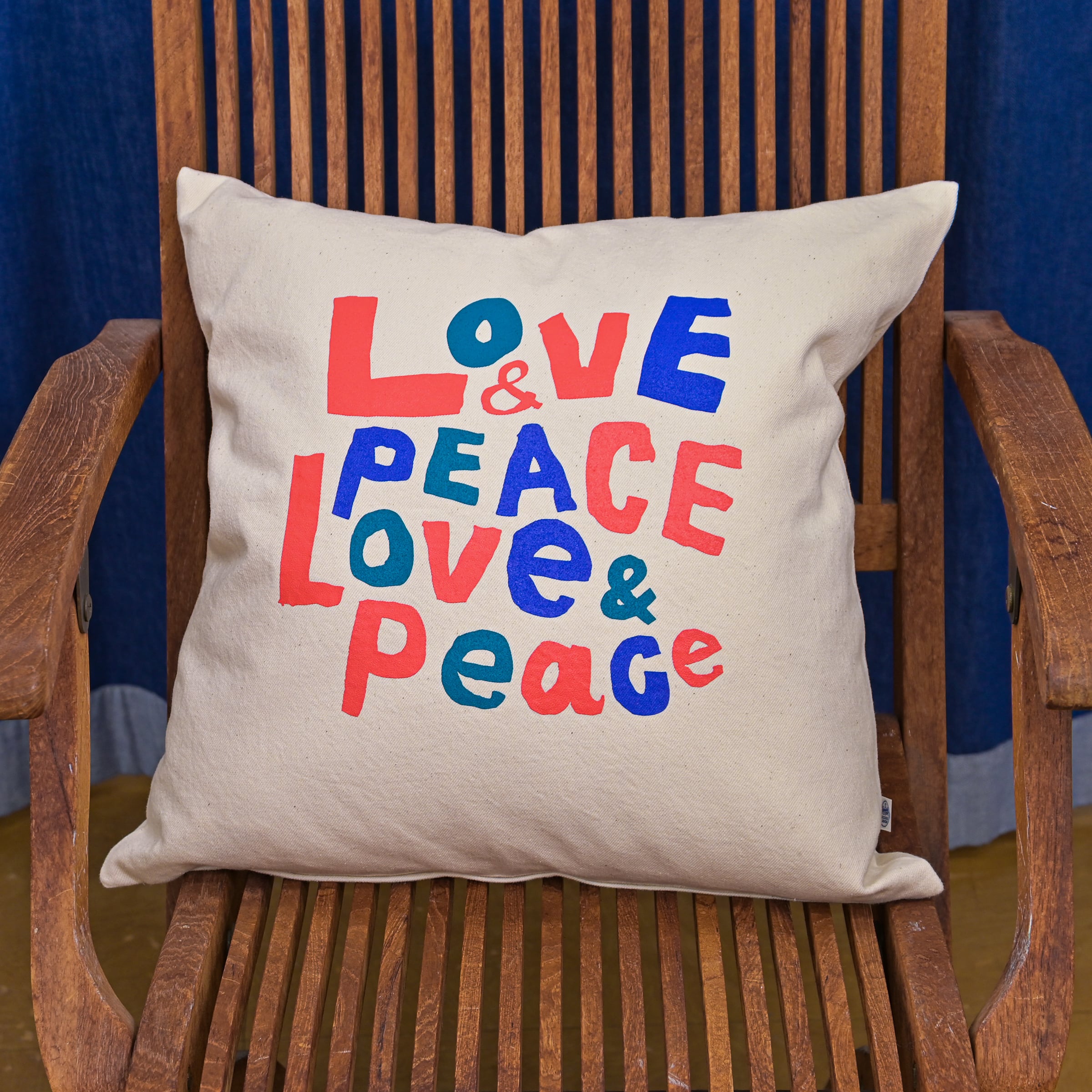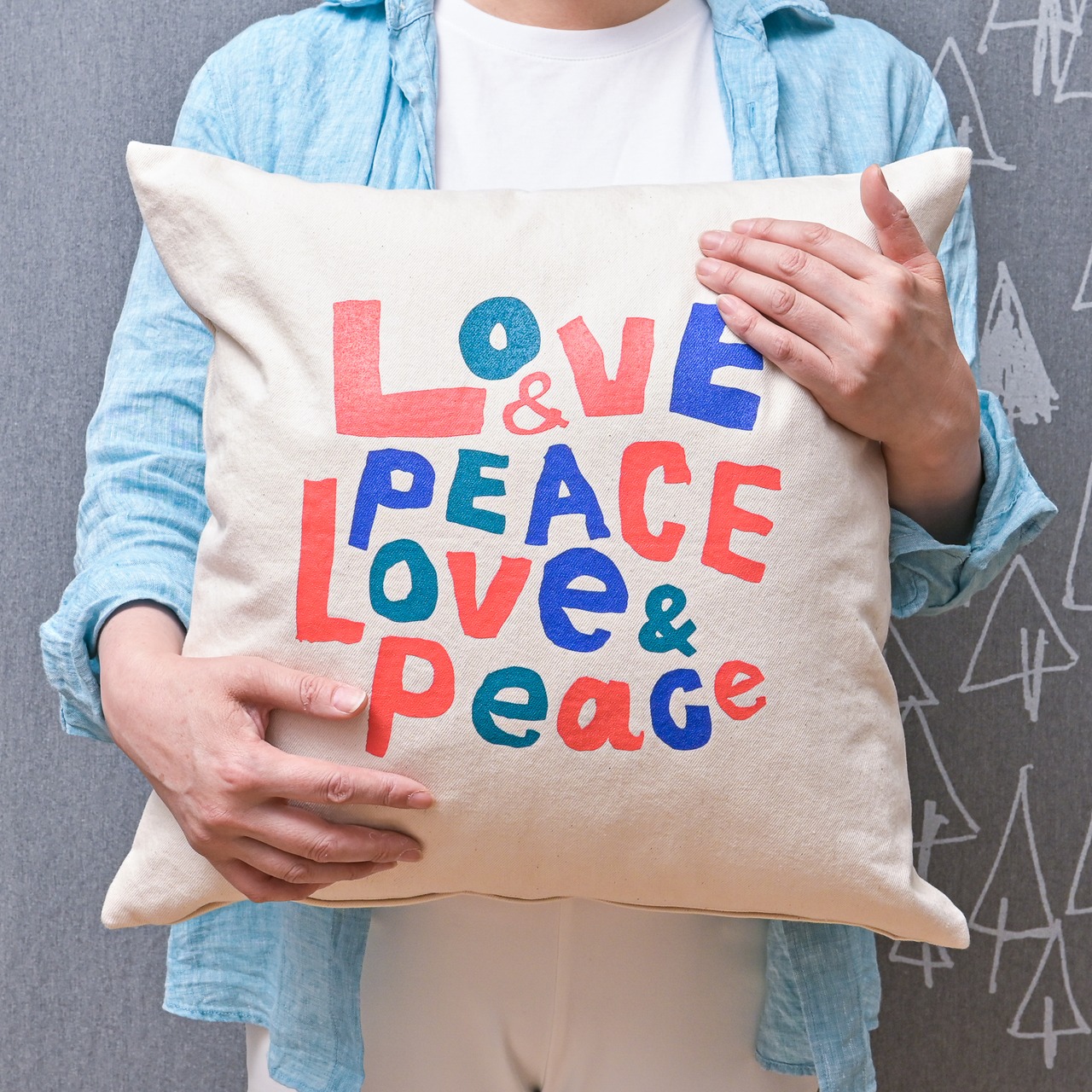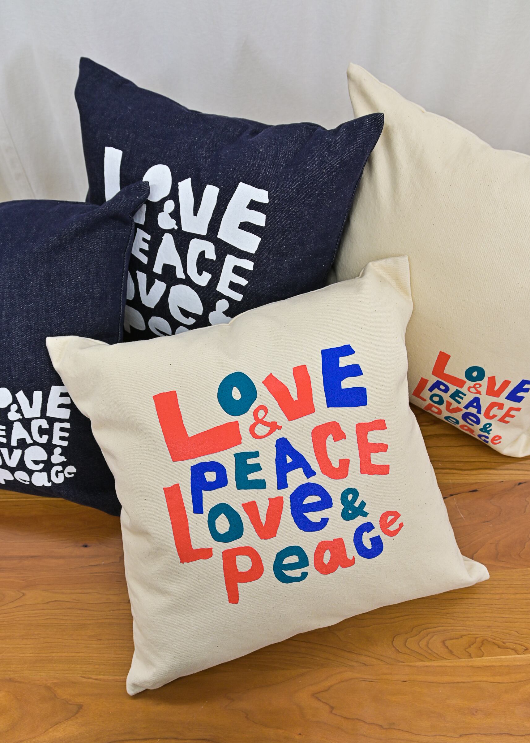 その場がパッと明るくなったり、見る人が元気になれるような、まさに平和と愛があふれたデニムクッションカバーが完成いたしました。