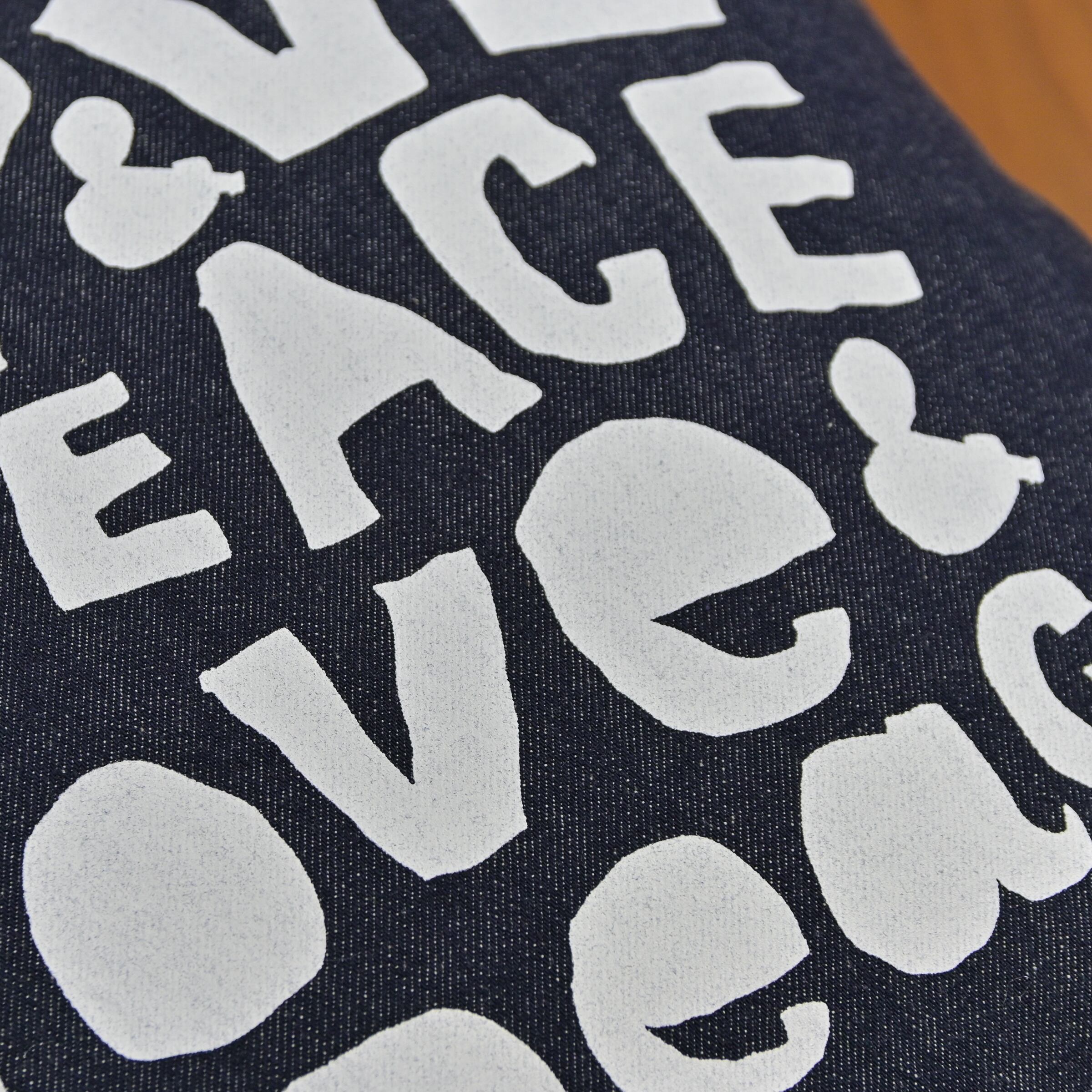 色落ちの心配のないデニム生地をベースにテキスタイルデザイナーの石北 有美氏の「LOVE & PEACE」をモチーフに使ったクッションカバーを作りました。
