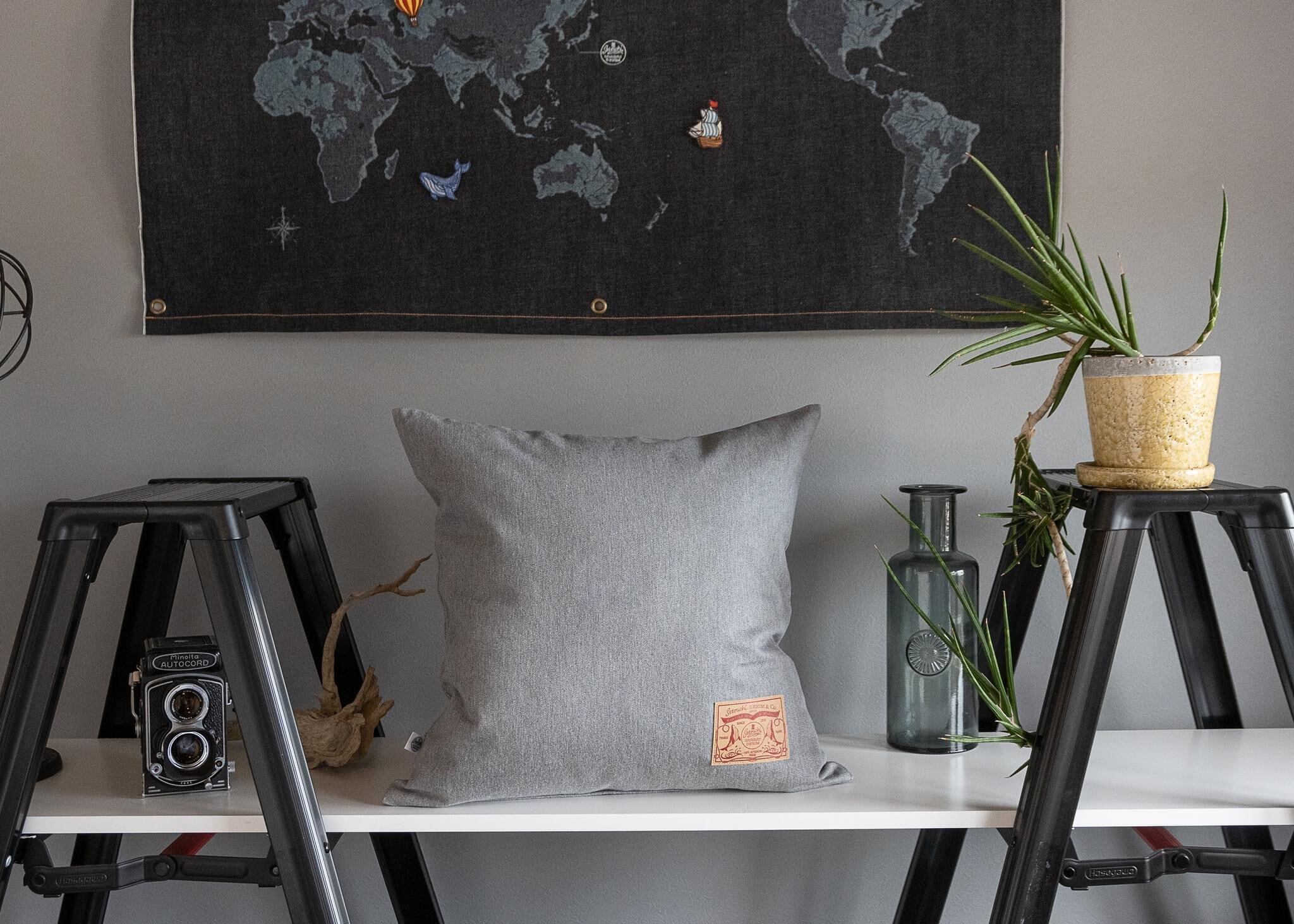 クッションカバー本体に使用している生地は、瀬戸内デニムの人気生地SD502グレー。綿の状態から染めるため、独特のメランジ感やわらかな手触りが気持ちいい上質な生地です。